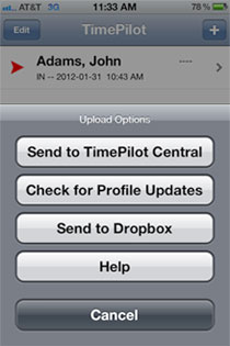 ![]() Ready to send your transactions to TimePilot Central? Just tap the icon in the lower left corner of the main screen and then tap "Send to TimePilot Central." The phone uses either a cellular data connection or a Wi-Fi connection to send the files to your Dropbox account, and from there to TimePilot Central on your PC. |