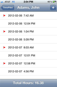 ![]() The App's main page shows the list of employees that have been set up on the phone. Just as in TimePilot Central, red arrows mean the employee is clocked in. The date and time of the employee's most recent clock-in or -out appears under his or her name, and their accumulated hours (the time between clock-ins and clock-outs) is shown to the right of the employee's name. |