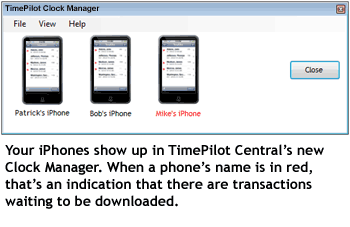Store. The TimePilot iPhone App turns your iPhone into a portable timeclock. Employees can clock in and out at an iPhone and the results can be transmitted to the PC running TimePilot Central. The App also runs on the iPad and the iPod Touch.